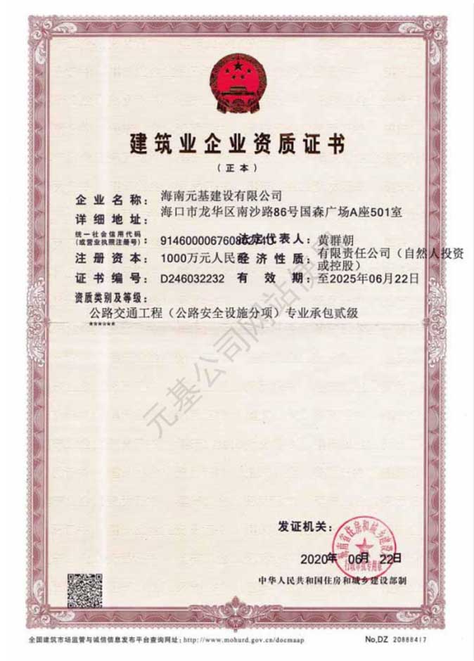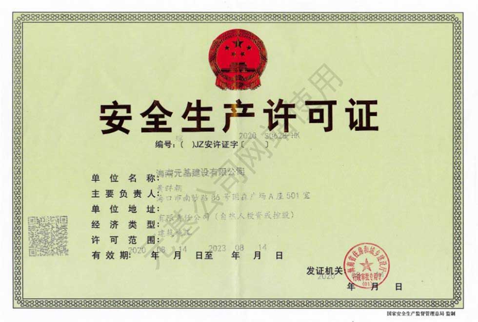 元基公司于2020年8月14日獲得由海南省住房和城鄉(xiāng)建設(shè)廳頒發(fā)的公路交通工程專業(yè)承包貳級(jí)建筑業(yè)企業(yè)資質(zhì)證書和安全許可證,現(xiàn)在可持證開展經(jīng)營業(yè)務(wù)。